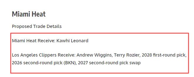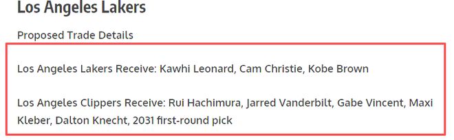 洛杉矶快船队得到:安德鲁·威金斯、特里·罗齐尔、2028年首轮选秀权、2026年第二轮选秀权(来自布鲁克林篮网)、2027年第二轮选秀权交换权