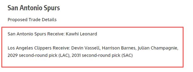 洛杉矶快船队得到:德文·瓦塞尔、哈里森·巴恩斯、朱利安·尚帕尼、2029年第二轮选秀权(来自洛杉矶快船)、2031年第二轮选秀权(来自萨克拉门托国王)