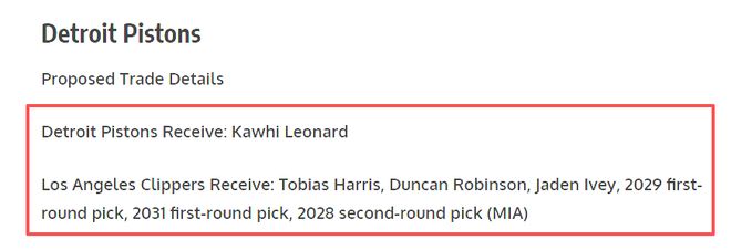 洛杉矶快船队得到:托比亚斯·哈里斯、邓肯·罗宾逊、贾登·艾维、2029年首轮选秀权、2031年首轮选秀权、2028年第二轮选秀权